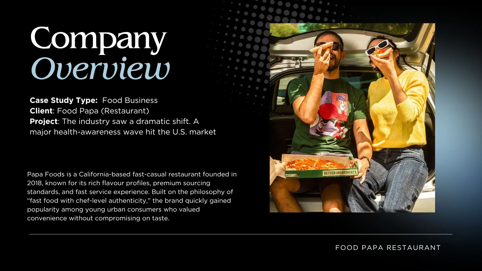 Papa Foods is a California-based fast-casual restaurant founded in 2018, known for its rich flavour profiles, premium sourcing standards, and fast service experience. Built on the philosophy of “fast food with chef-level authenticity,” the brand quickly gained popularity among young urban consumers who valued convenience without compromising on taste.