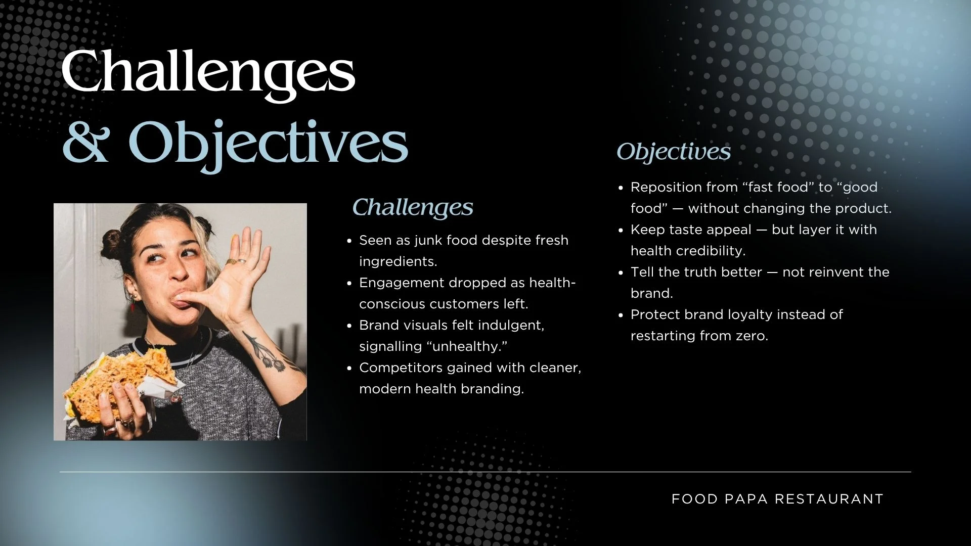 In 2022, Papa Foods was increasingly perceived as “junk food” despite using fresh, high-quality ingredients. This misperception led to declining engagement, silent boycotts, and difficulty competing with health-forward brands. The challenge was to shift consumer perception from indulgent fast food to a brand that is both tasty and responsible, without changing the menu or alienating loyal customers.