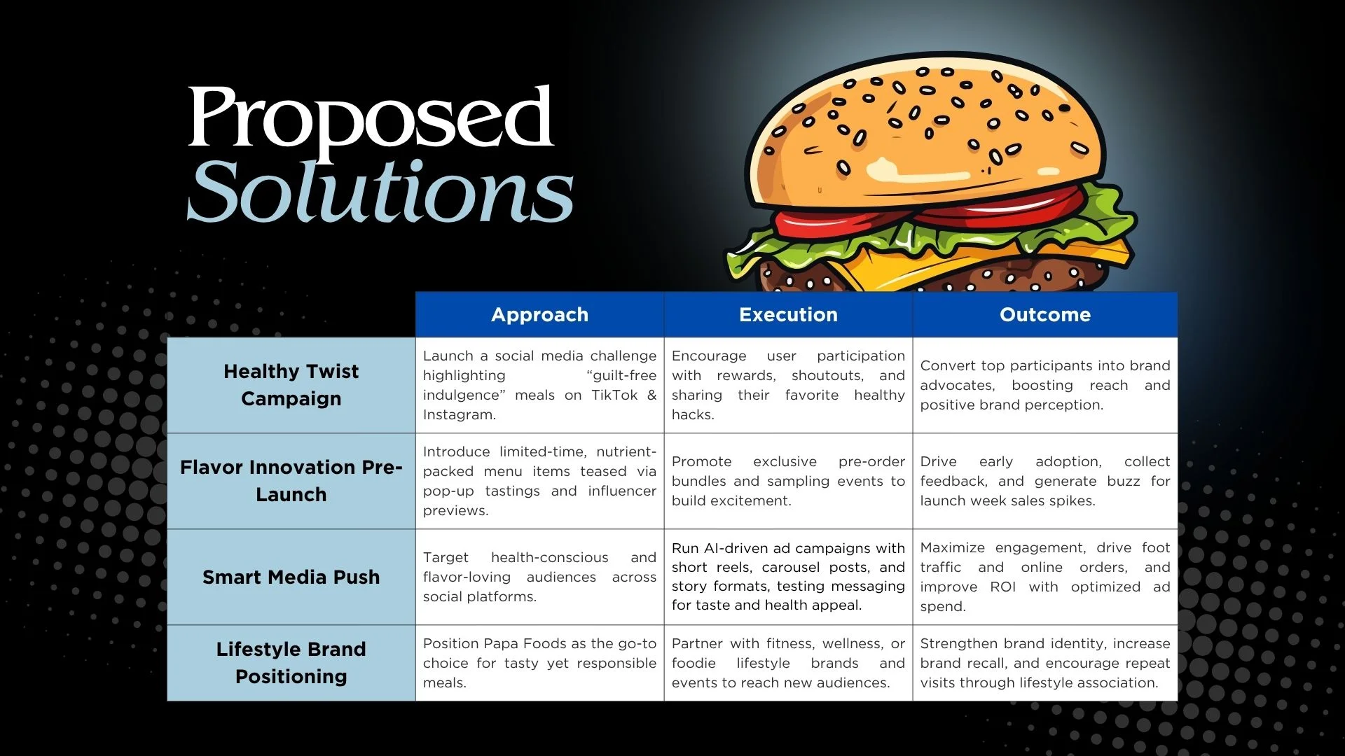 | Lifestyle Brand Positioning | Position Papa Foods as the go-to choice for tasty yet responsible meals. | Partner with fitness, wellness, or foodie lifestyle brands and events to reach new audiences. | Strengthen brand identity, increase brand recall, and encourage repeat visits through lifestyle association. |