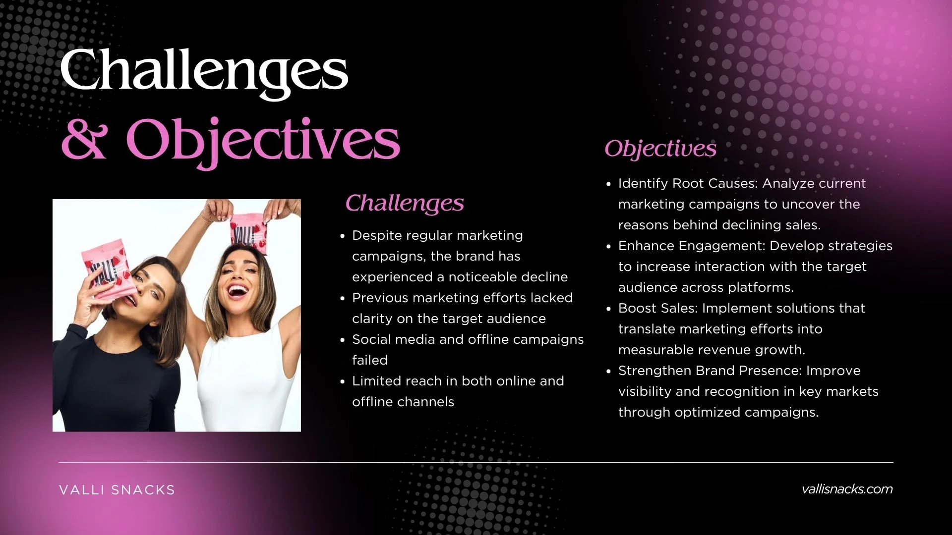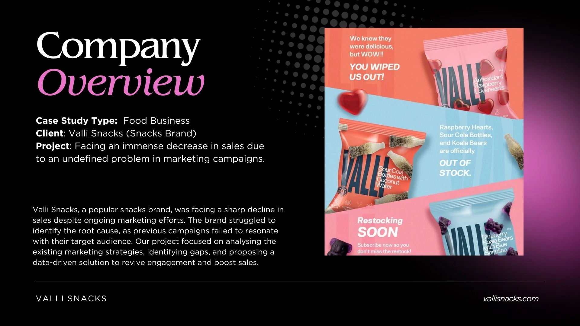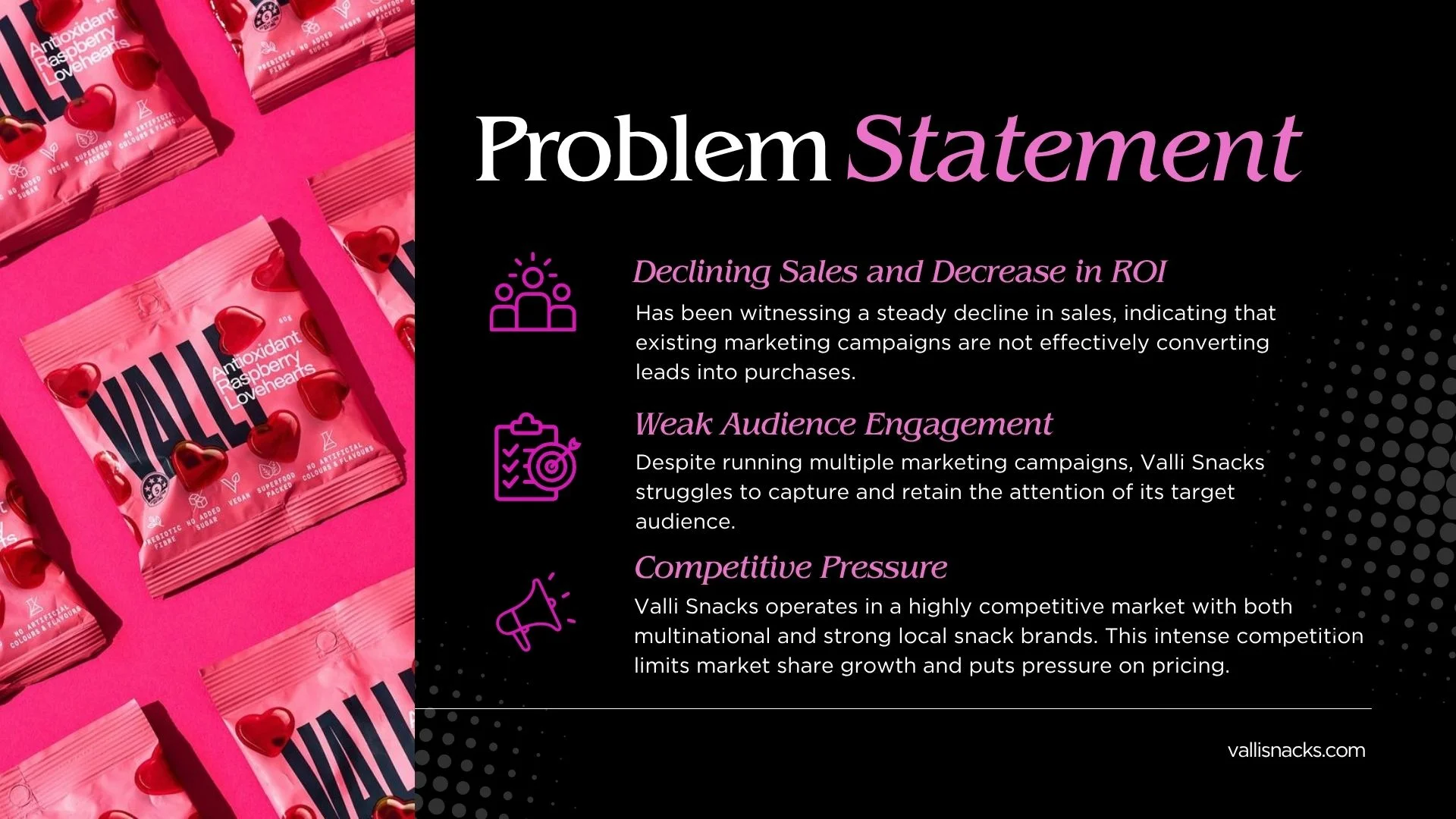 Valli Snacks is a mid-sized packaged snacks brand known for delivering flavorful, locally inspired snack products. The brand has a strong offline retail presence and a loyal customer base from previous years — but recently struggled to maintain digital relevance and compete against aggressively marketed international and local players. Despite consistent marketing spend, sales began to dip and ROI continued to decline month after month.
