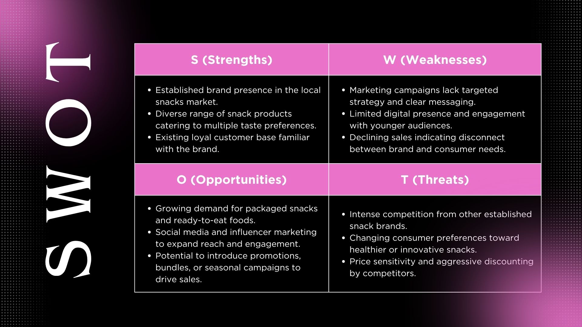 Threats: Global + local competition, shifting towards healthier snacking, price war