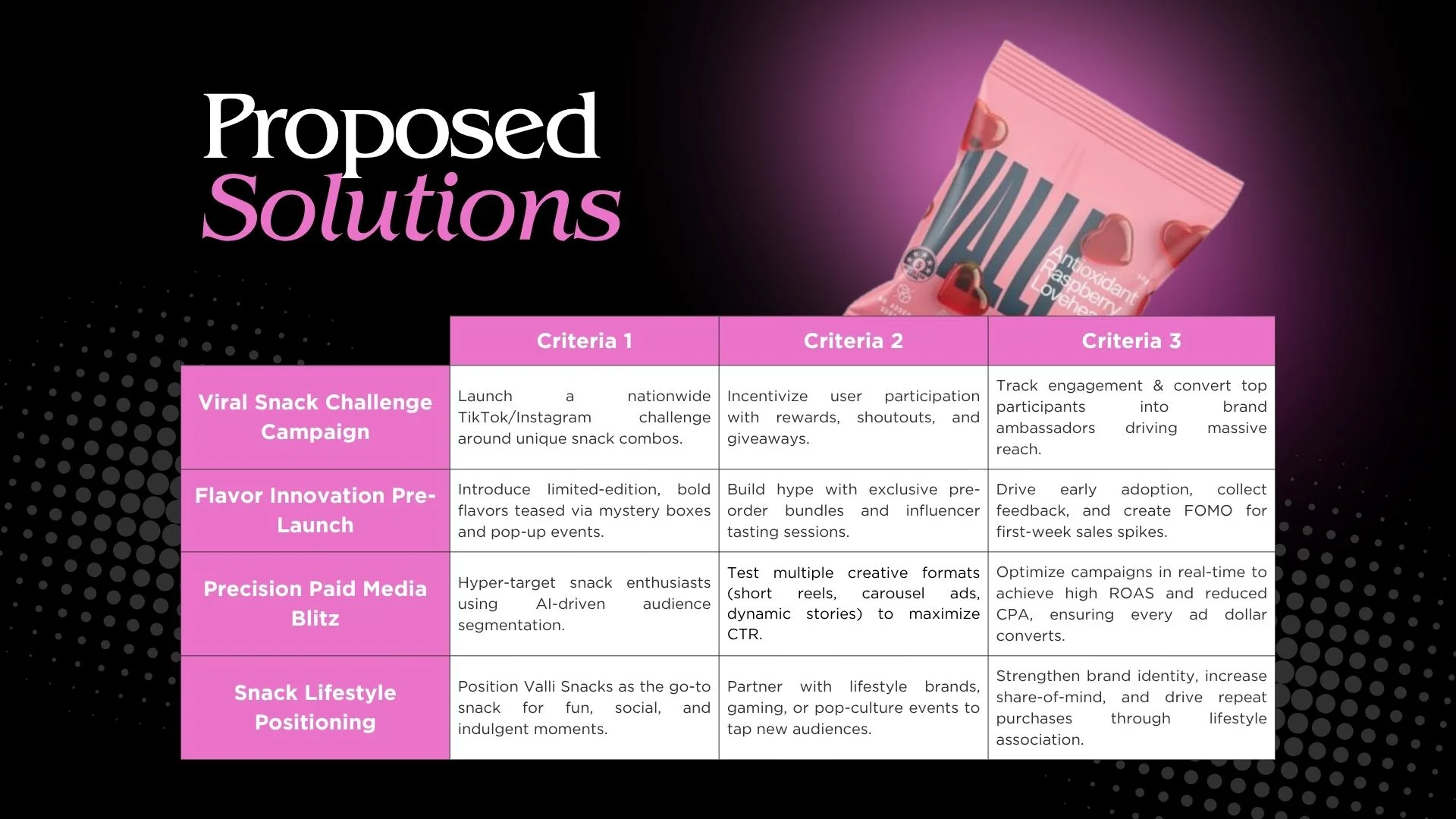 | Viral Snack Challenge | TikTok/Instagram challenge around unique ways to enjoy Valli snacks | Mass organic reach, Gen Z connection, UGC explosion |